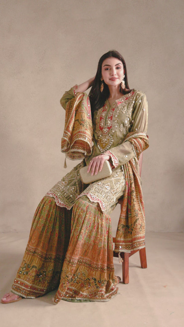 La Radi Shimmer Set | Coding, Hand & Gotta Work, Crepe Print Dupatta →