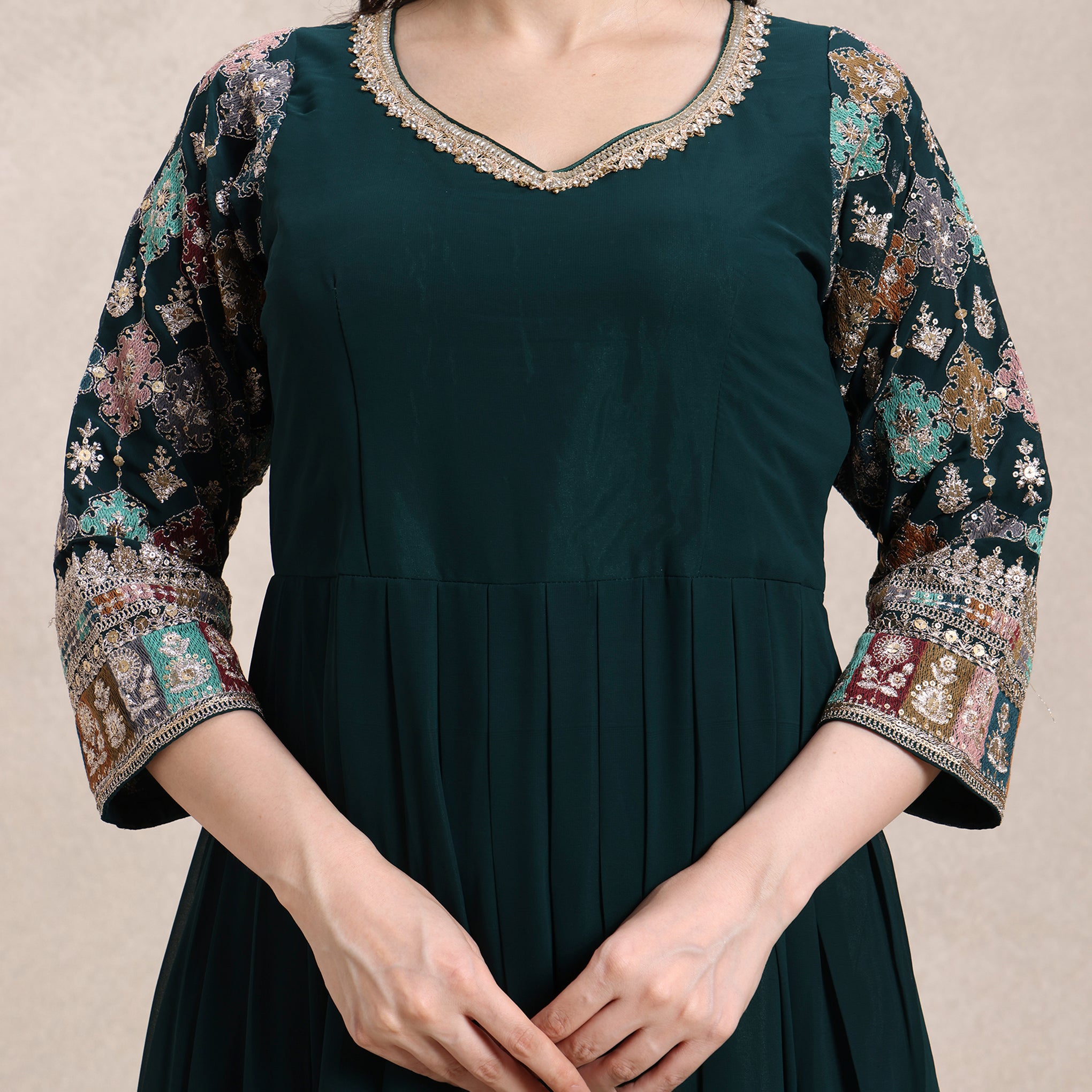 The fluid georgette Anarkali offers a twirl‑ready flare and a flattering, elongating silhouette, while the neckline, sleeve hems, and borders are highlighted with artisanal multi embroidery and handwork for refined sparkle.