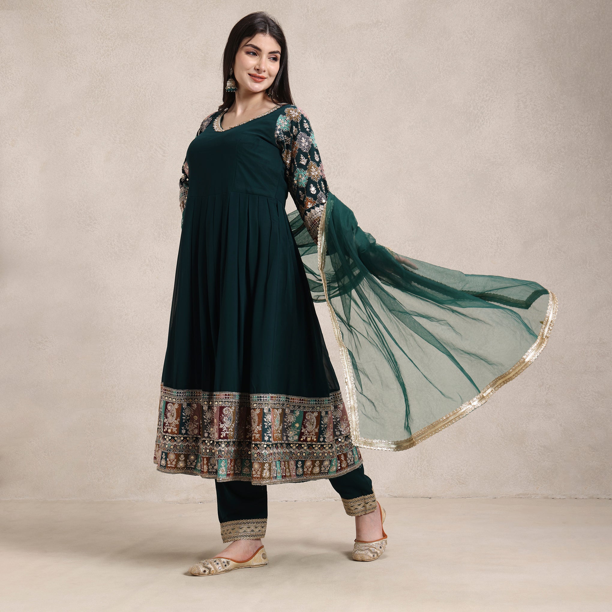 A wedding guest Anarkali with multi embroidery borders and sleeve detailing for modern elegance, and a travel friendly georgette Anarkali set with four side lace dupatta that steams back to perfection.