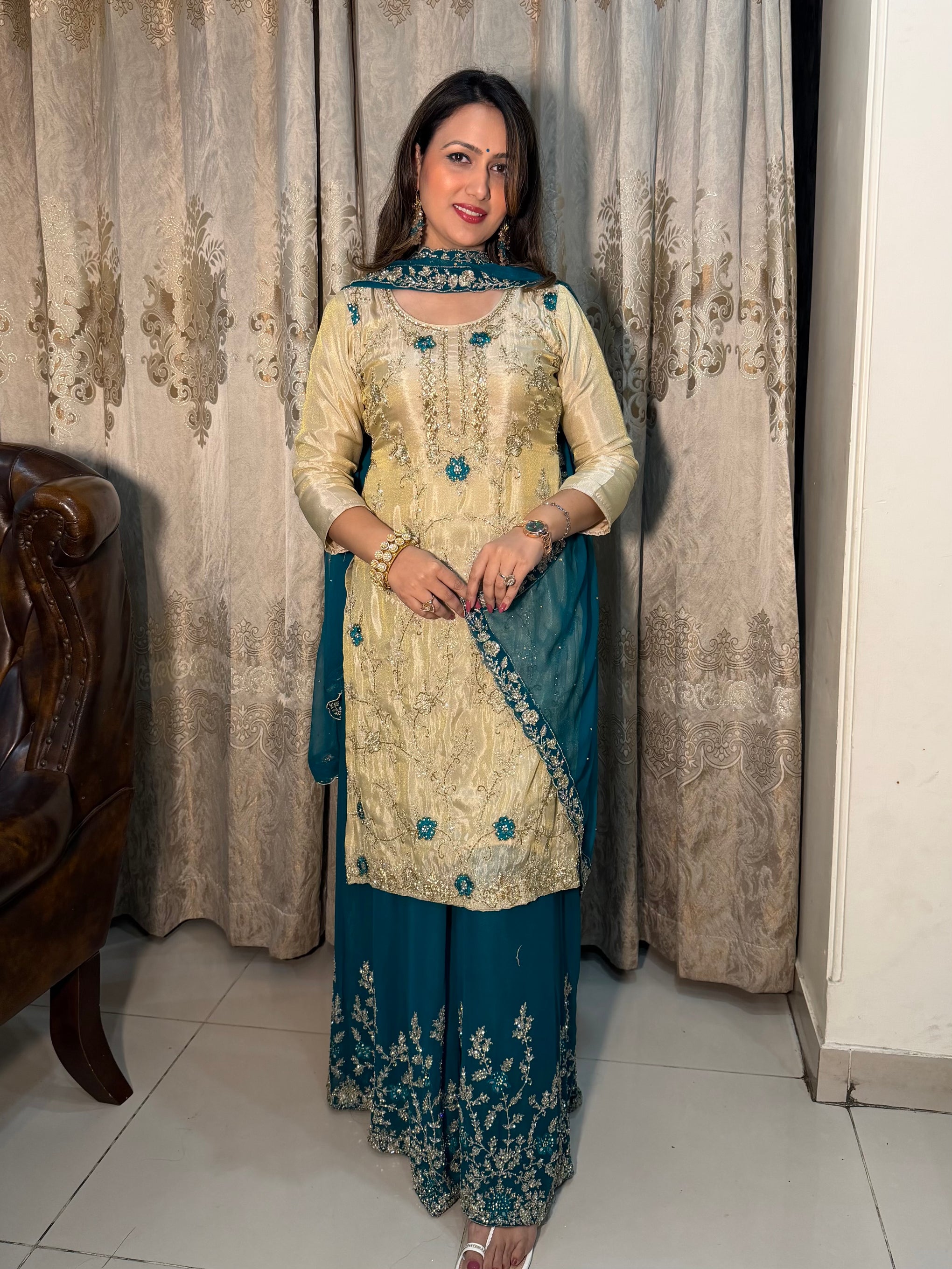 La Radi | Georgette Plazo & Shimmer Shirt Set with Pure Hand Work and Embroidered Dupatta