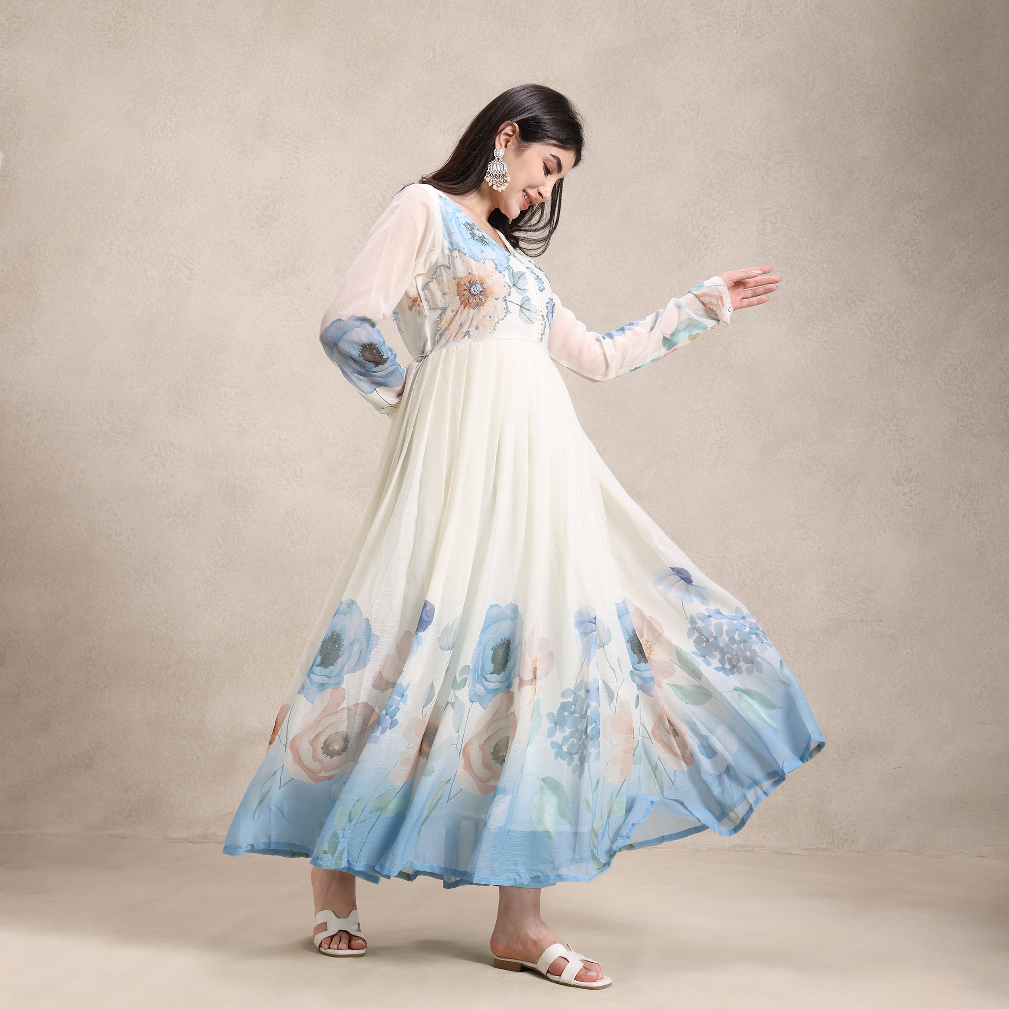 For festive calendars, a lightweight chiffon anarkali with printed dupatta and breathable cotton pant for warm days, a party wear chiffon digital print anarkali with hand embroidered neckline for reception nights.