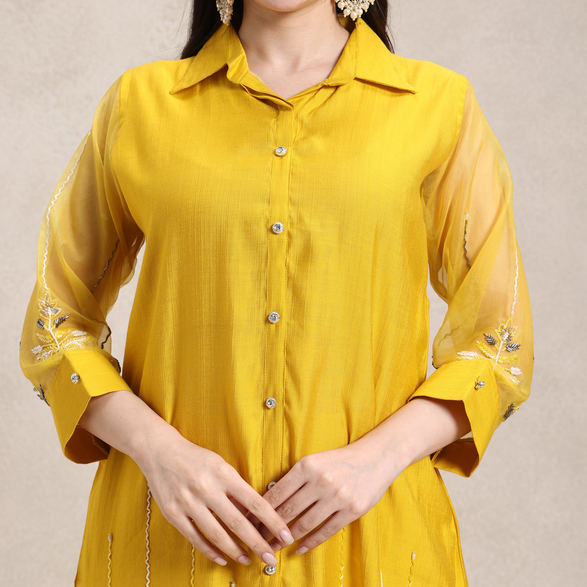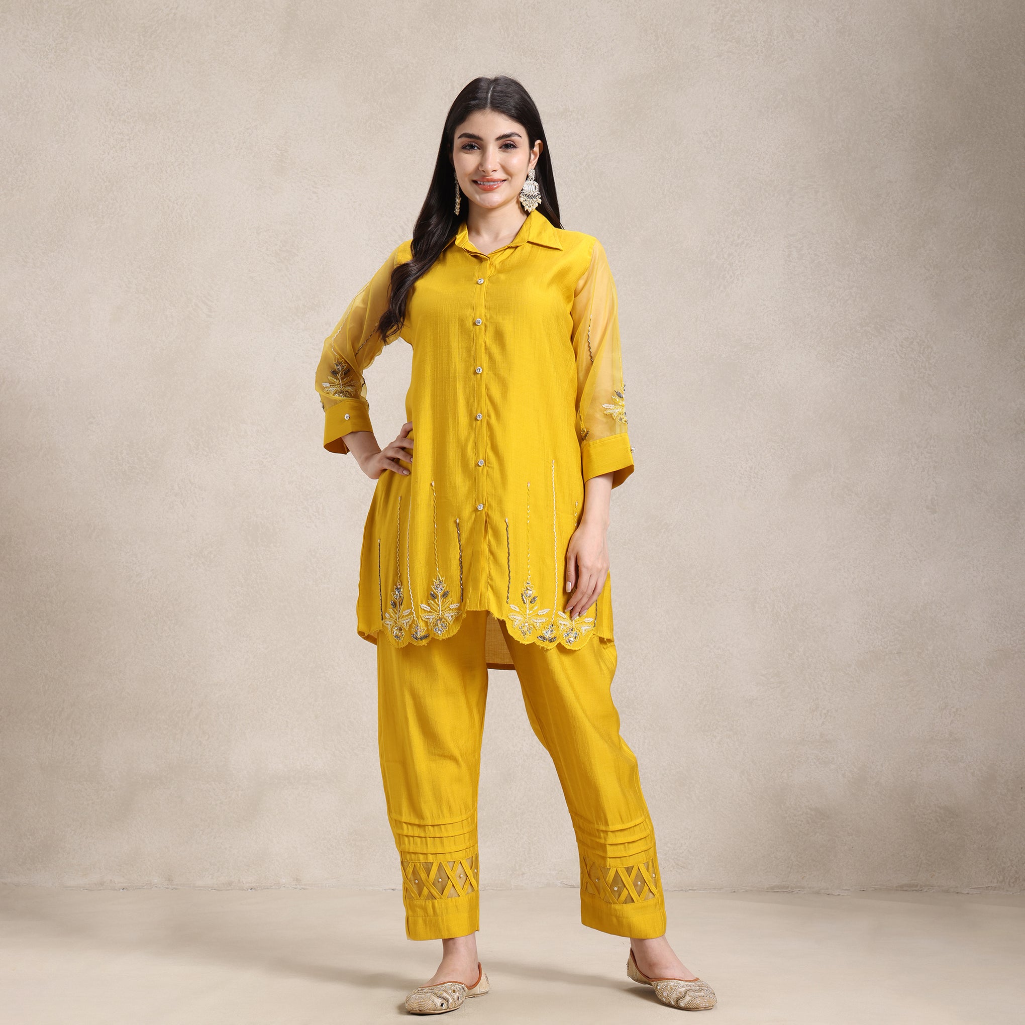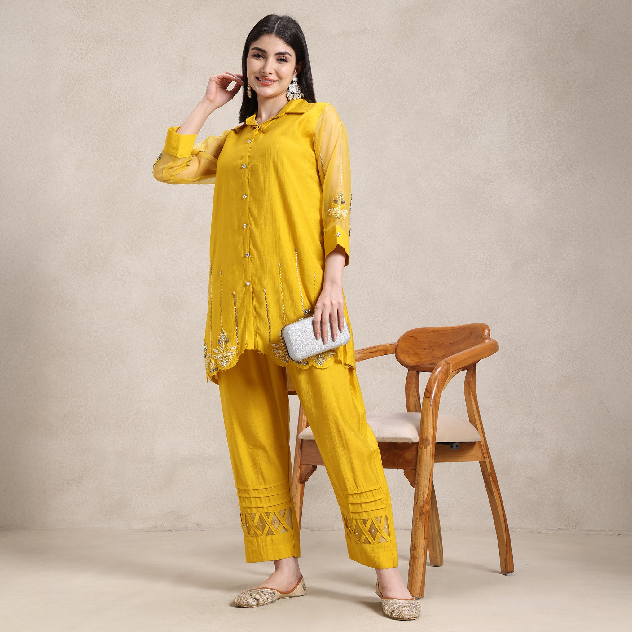 casual festive muslin co‑ord with hand embellished sleeves If searching for a look that’s refined yet relaxed, this La Radi co‑ord delivers: a cotton muslin hand work co‑ord set elevated by net sleeves hand work, designed to style up or down.