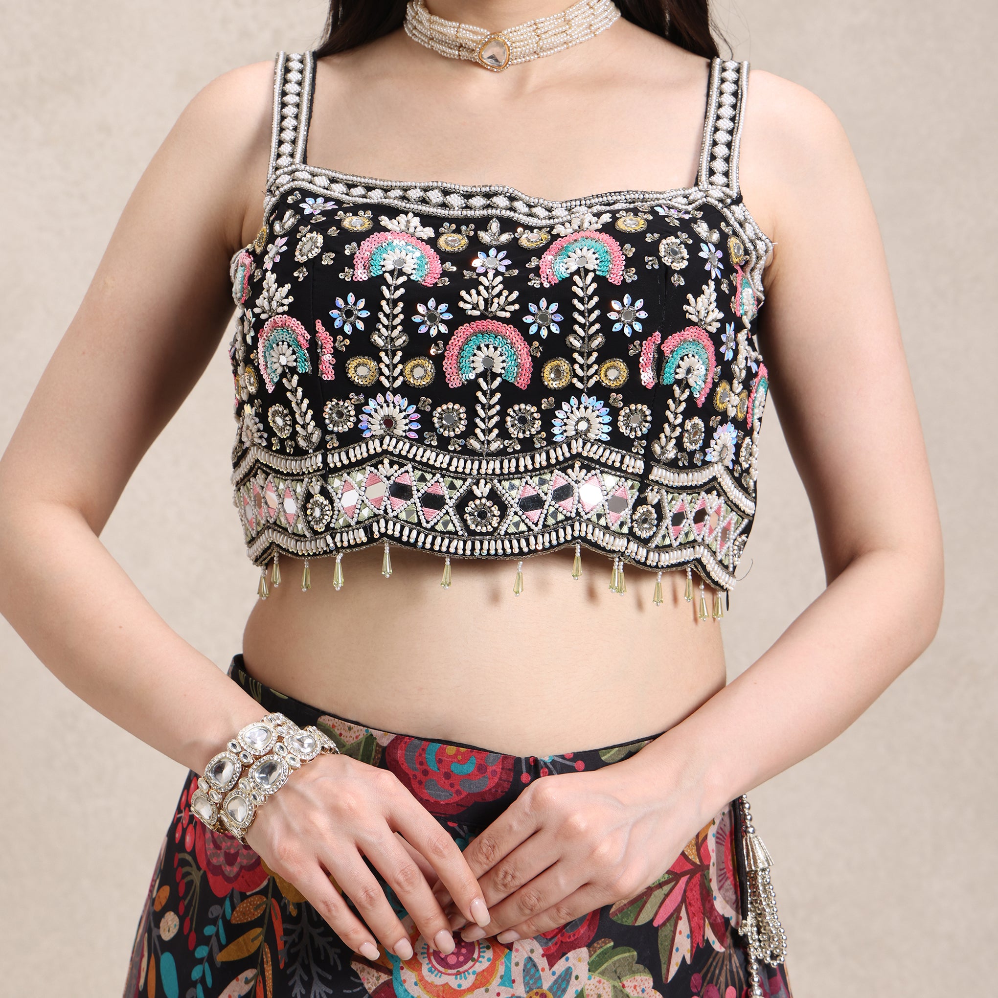 The lehenga’s premium digital print brings color depth and clarity with a fluid georgette drape that moves beautifully.