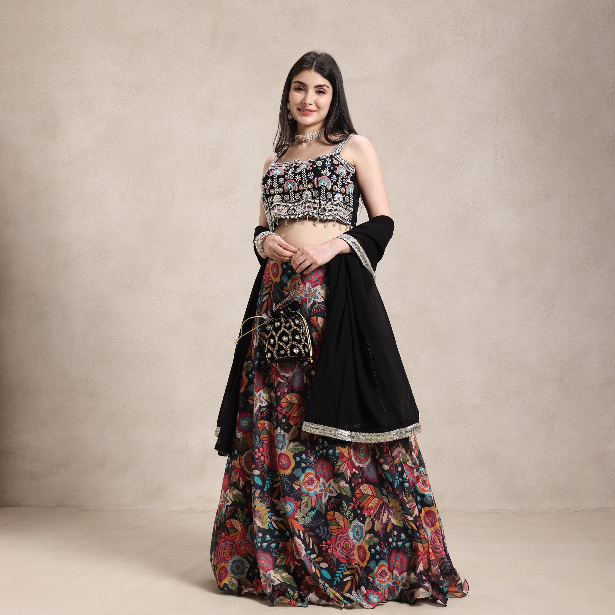 In the box: 1 Georgette Digital Print Lehenga, 1 Georgette & Net Hand Work Choli/Crop Top, 1 Net Dupatta (Four‑Sided Lace)