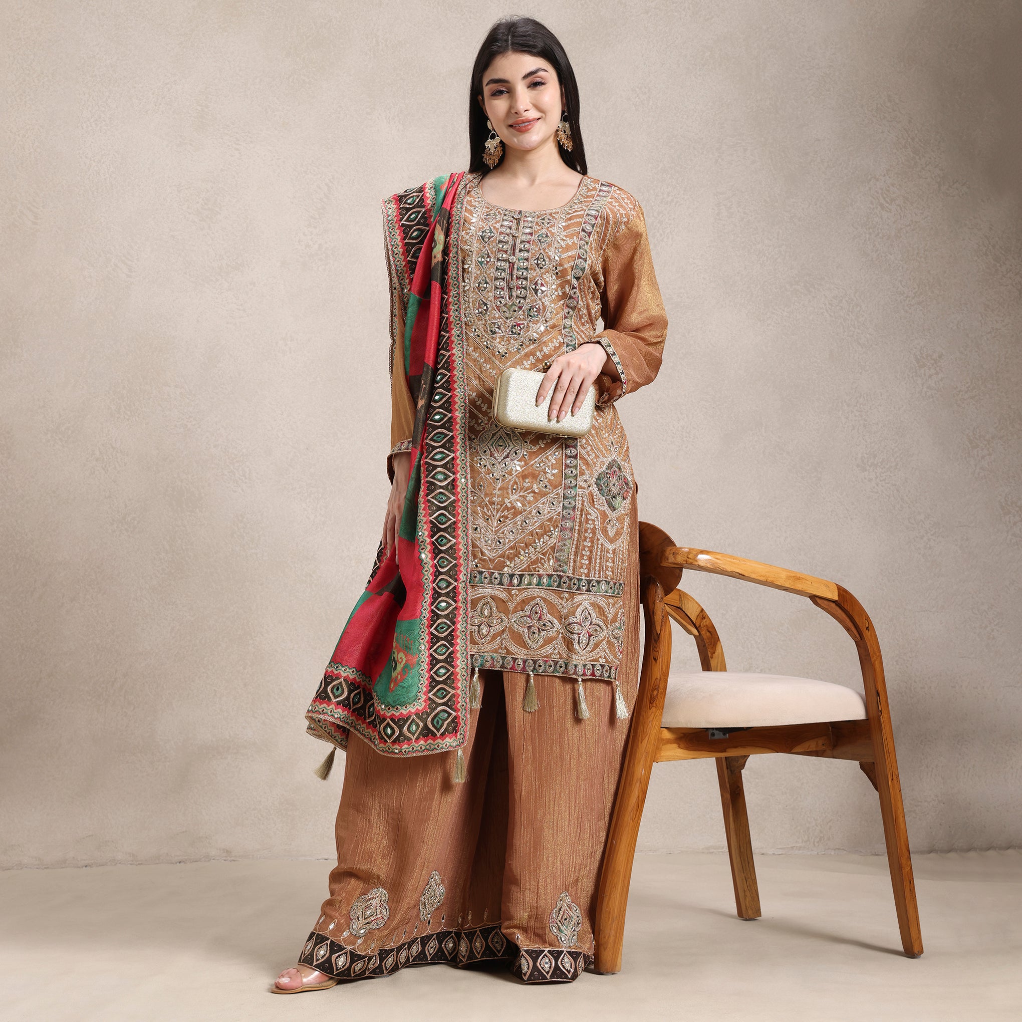 This ensemble matches a shimmer shirt with coding & hand + gotta work for weddings, pairs as a shimmer plazo gotta work party wear set for cocktails, completes as a crepe digital print dupatta with shimmer suit for receptions.