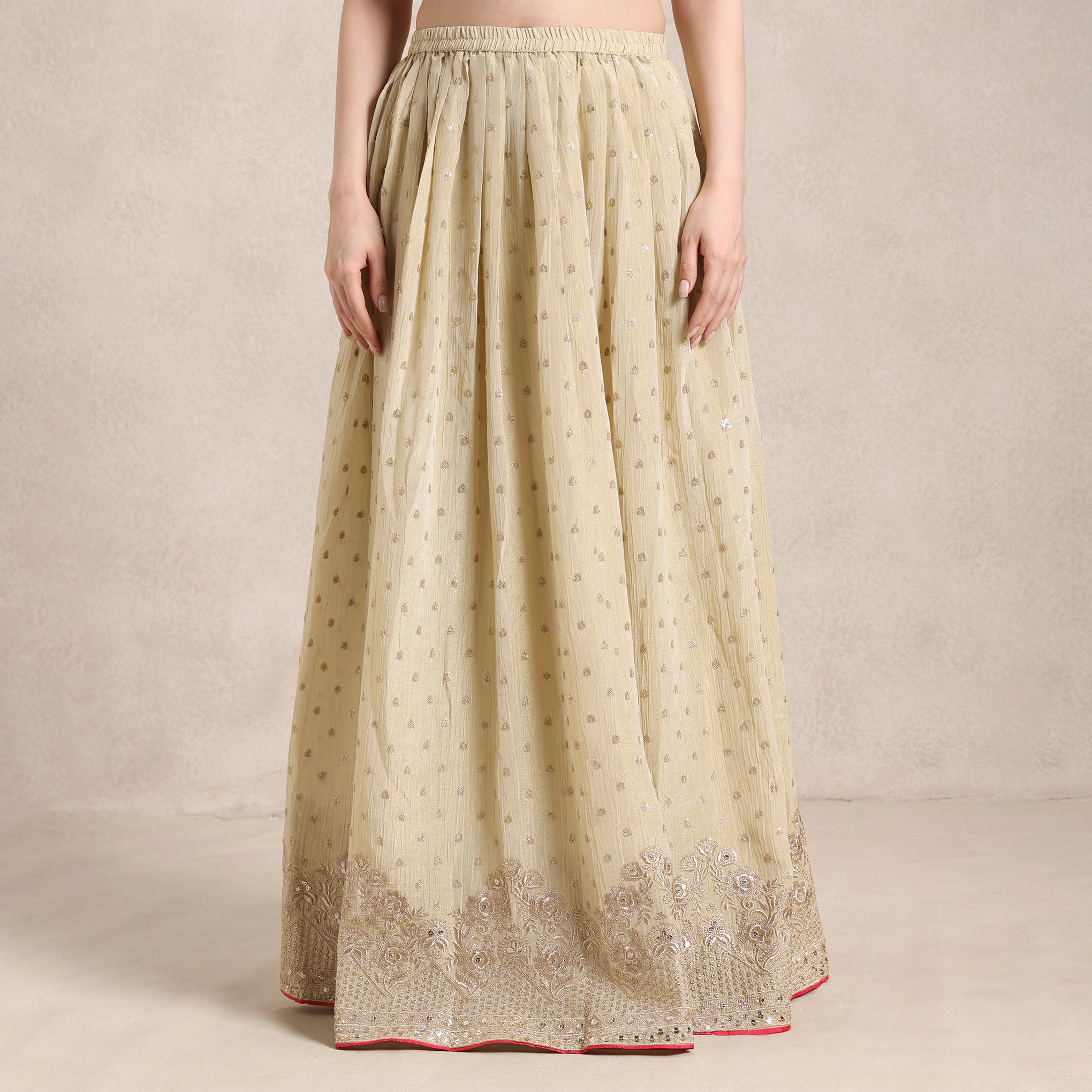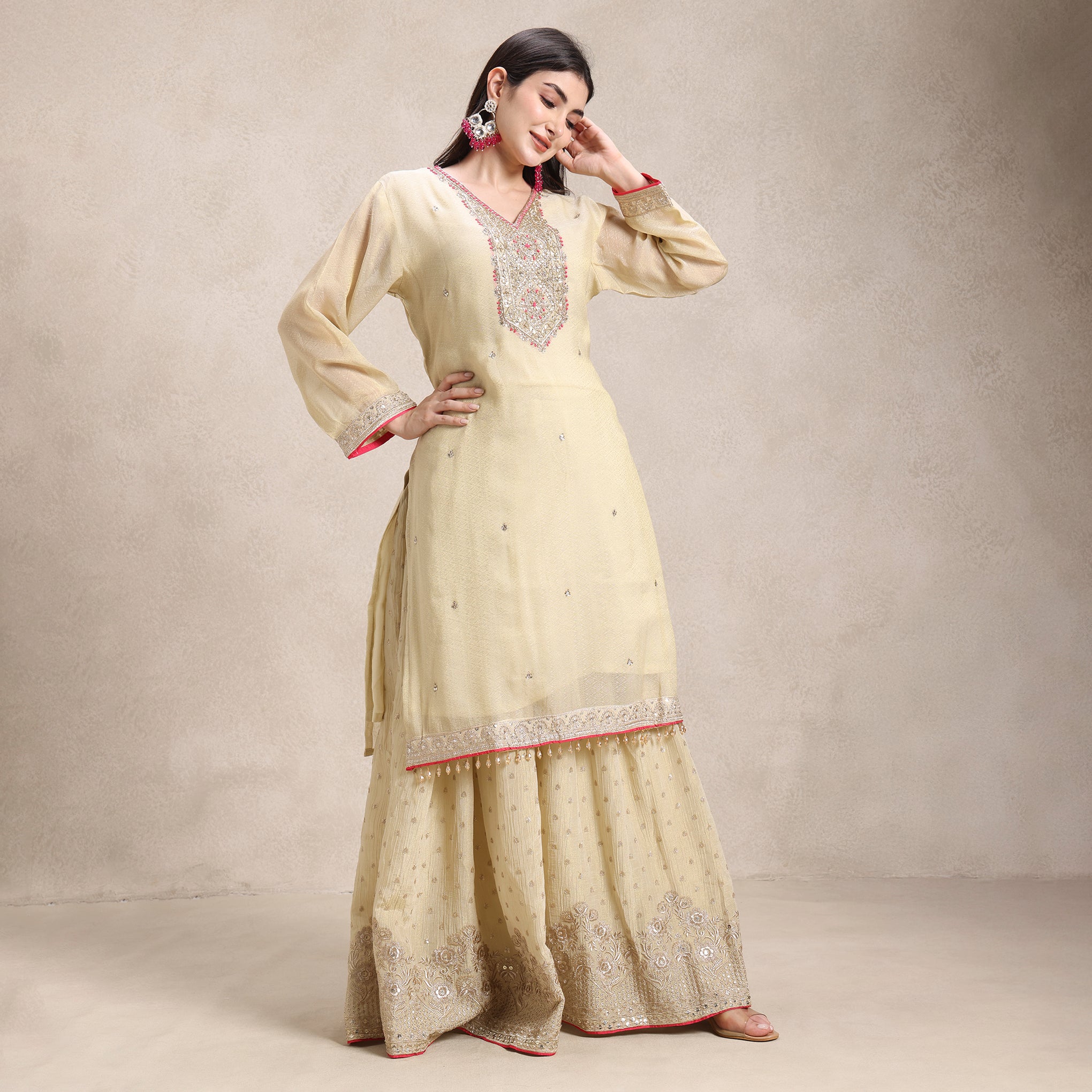 The kurta showcases heritage zardozi hand work—meticulously placed along the neckline, sleeves, and hem for a luxe finish—while the skirt (or skirt‑style lower/gharara) features precise skirt coding work that creates structured flare and graceful movement. The contrast pure chiffon dupatta frames the look with an airy drape and embroidered finishing, tying the whole outfit together with polished harmony.