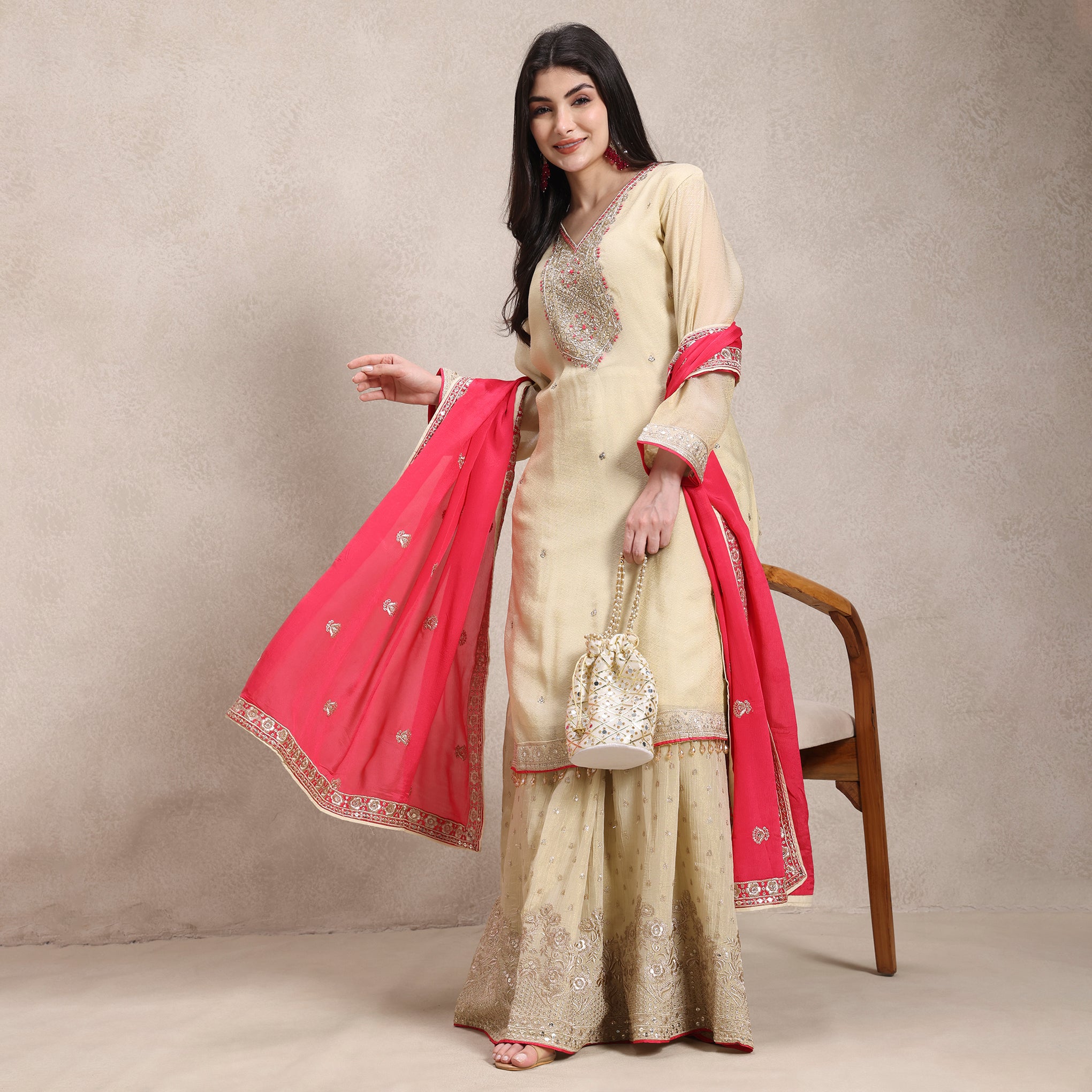 La Radi Shimmer Suit with Pure Zardozi Hand Work & Contrast Chiffon Dupatta